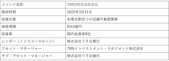 人と街に関わるすべてのことを総合的に支援する店舗流通ネット株式会社(東京都港区:代表取締役社長戸所 岳大)は、100%出資子会社のTRNインベストメント・マネジメント株式会社(以下、 TIM)と株式会社りそな銀行が、共同で開発型(都市型店舗不動産)私募ファンド(以下、本ファンド)を組成することをお知らせいたします。本ファンドは、TIMをアセット・マネージャー、株式会社りそな銀行をサブ・アセット・マネージャーとし、複数の国内投資家から総額約18億円の出資を受け、本厚木駅前の都市型店舗不動産の開発を目的として組成されるものです。