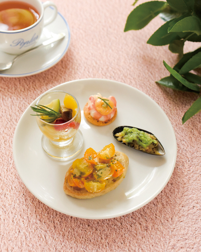 <下段>シュリンプ&トマトサブレ、ムール貝とアサリのファルシ、