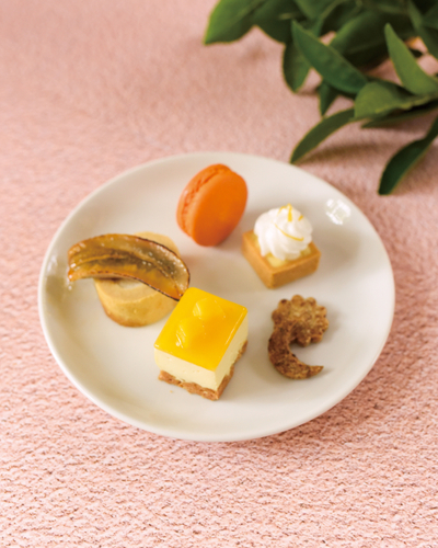 今夏は 「コートダジュール」 をテーマに、瑞々しくジューシーなトロピカルフルーツを用いた、南仏イメージのビビットな色合いのデザートたち。 夏らしく、瑞々しく軽い甘さにこだわった構成で、サマーバケーションの雰囲気をスイーツで表現しました。店内の大きな窓から望む、緑あふれる木々や洋館、石畳の中庭など、景観も彩りを添え、南仏のリゾートホテルで楽しむティータイムのような、優雅なティータイムを演出します。