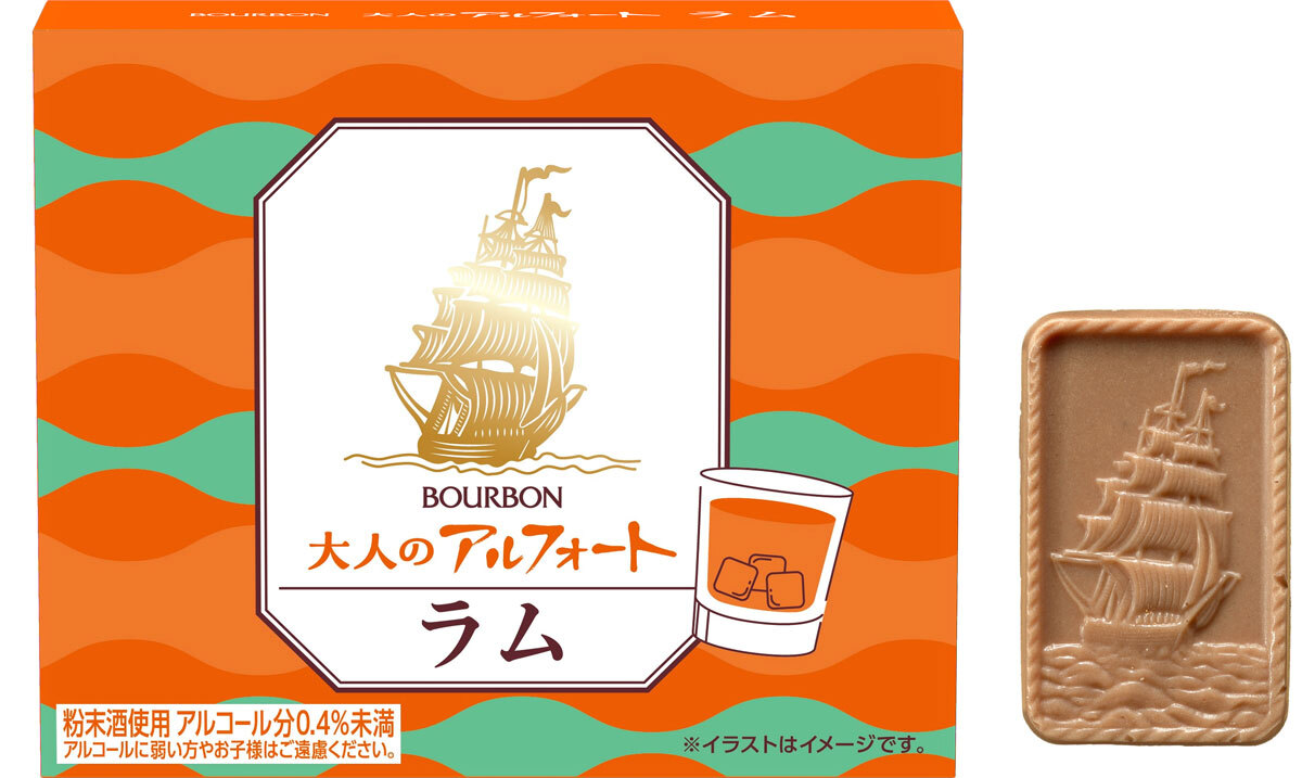 「大人のアルフォートラム」は、ラムの粉末酒を加えたチョコレートとラム酒を加えたこの商品専用のビスケットを組み合わせました。芳醇なラムの風味が香るアルフォートをお楽しみいただけます。