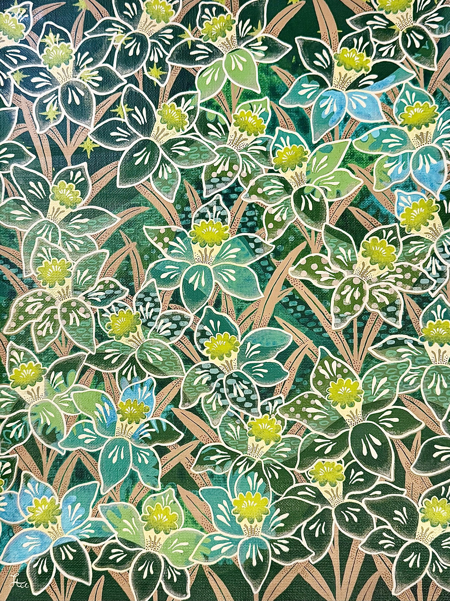 花や鳥のモチーフを通して、日常にひそむ感情や気配を軽やかに描き出す作家。伸びやかな線と鮮やかな色彩が特徴的な画面は、親しみやすさの中に確かな構成力を備え、空間に明るいリズムをもたらす。見る者それぞれの記憶や感情にそっと寄り添うような表現が、作品に静かな余韻を残している。