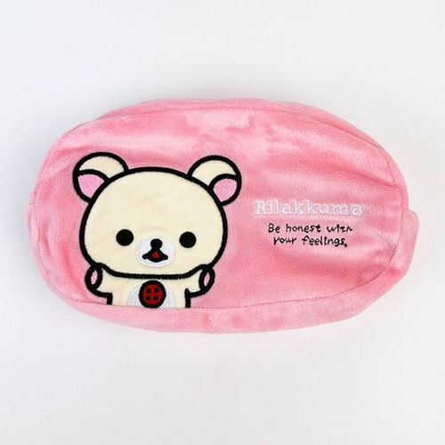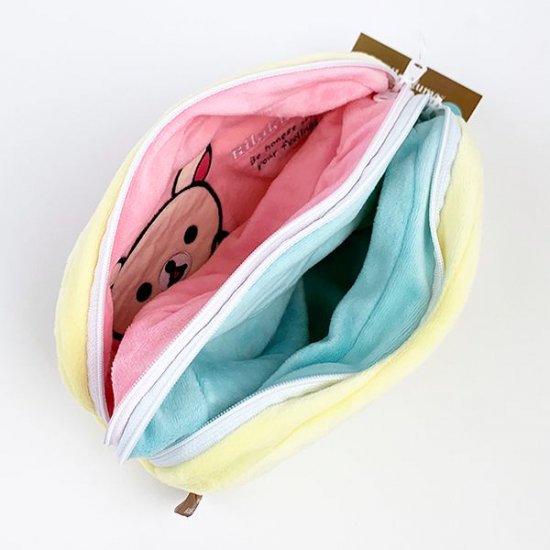 持ち運べるリラックマグッズとしてはポーチがオススメ。こちらのポーチは3面ポーチといって1個で3種類にデザインが変化します。生地がふわふわでブランケットのような温かみもあるんです!