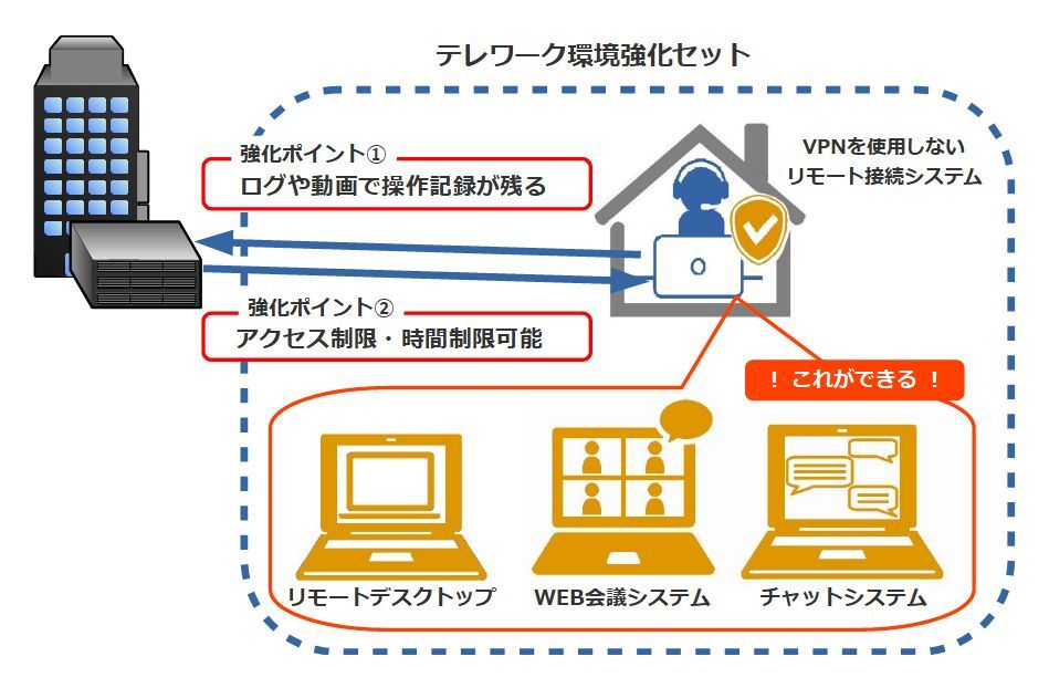 『テレワーク環境強化セット』では、初めてテレワークを導入する企業だけでなく、すでにVPN接続によるテレワークを実施している企業へもプラスのテレワーク機能として利用できるセットとなっています。