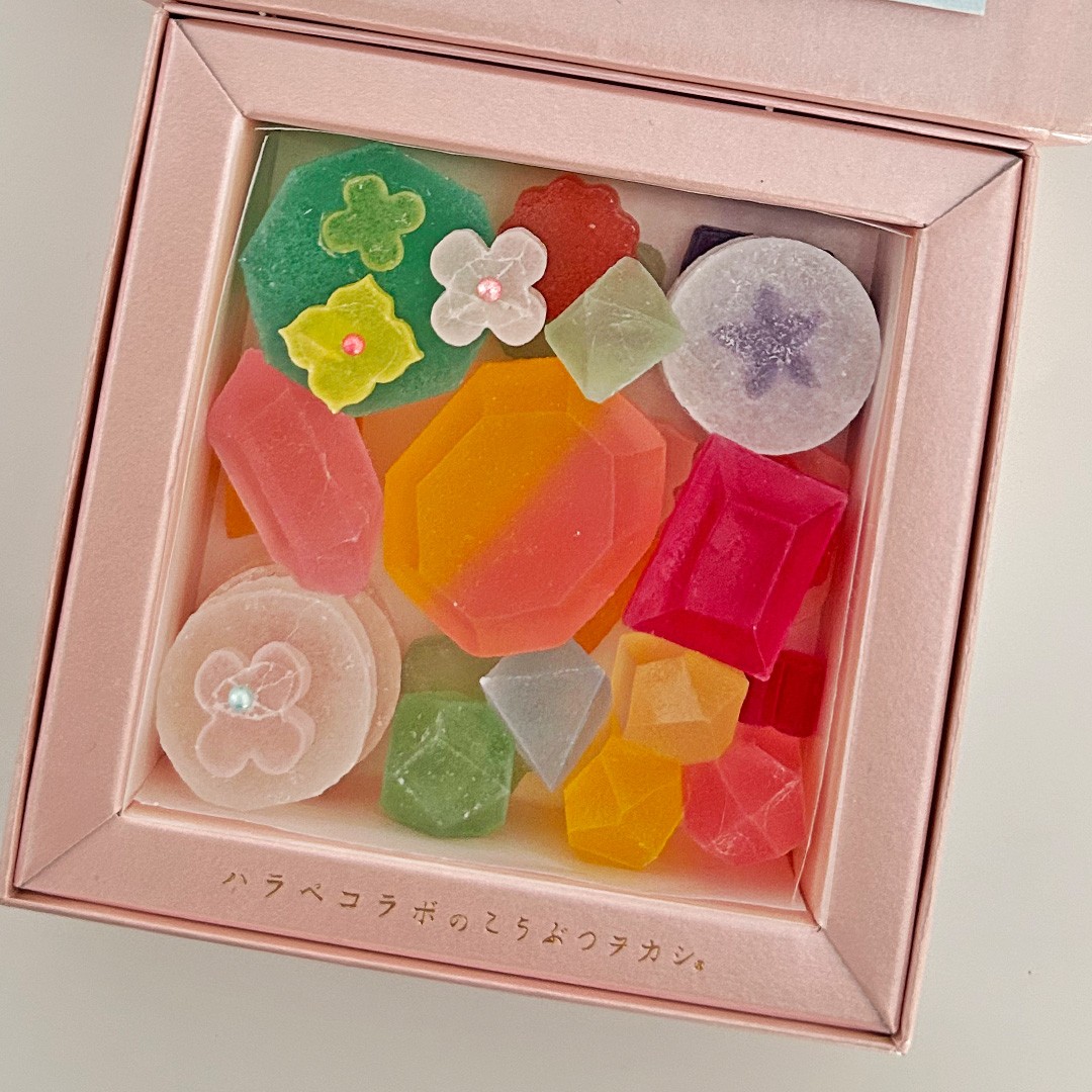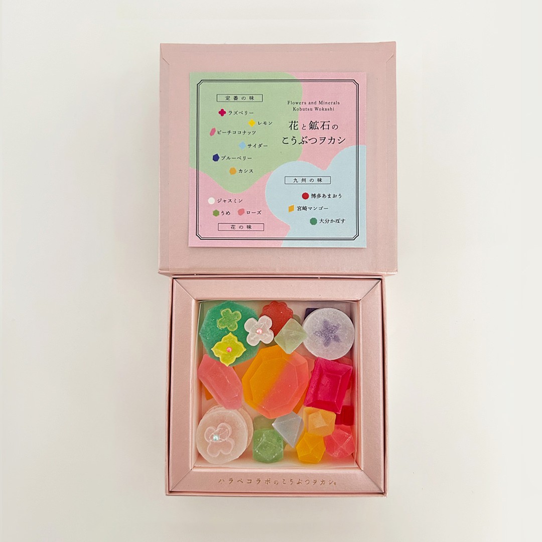 愛と美の象徴でもあるローズクォーツや蛍石をモチーフにした鉱物のカタチと優しい彩りの琥珀糖が春の香りを運んできてくれる1箱です。