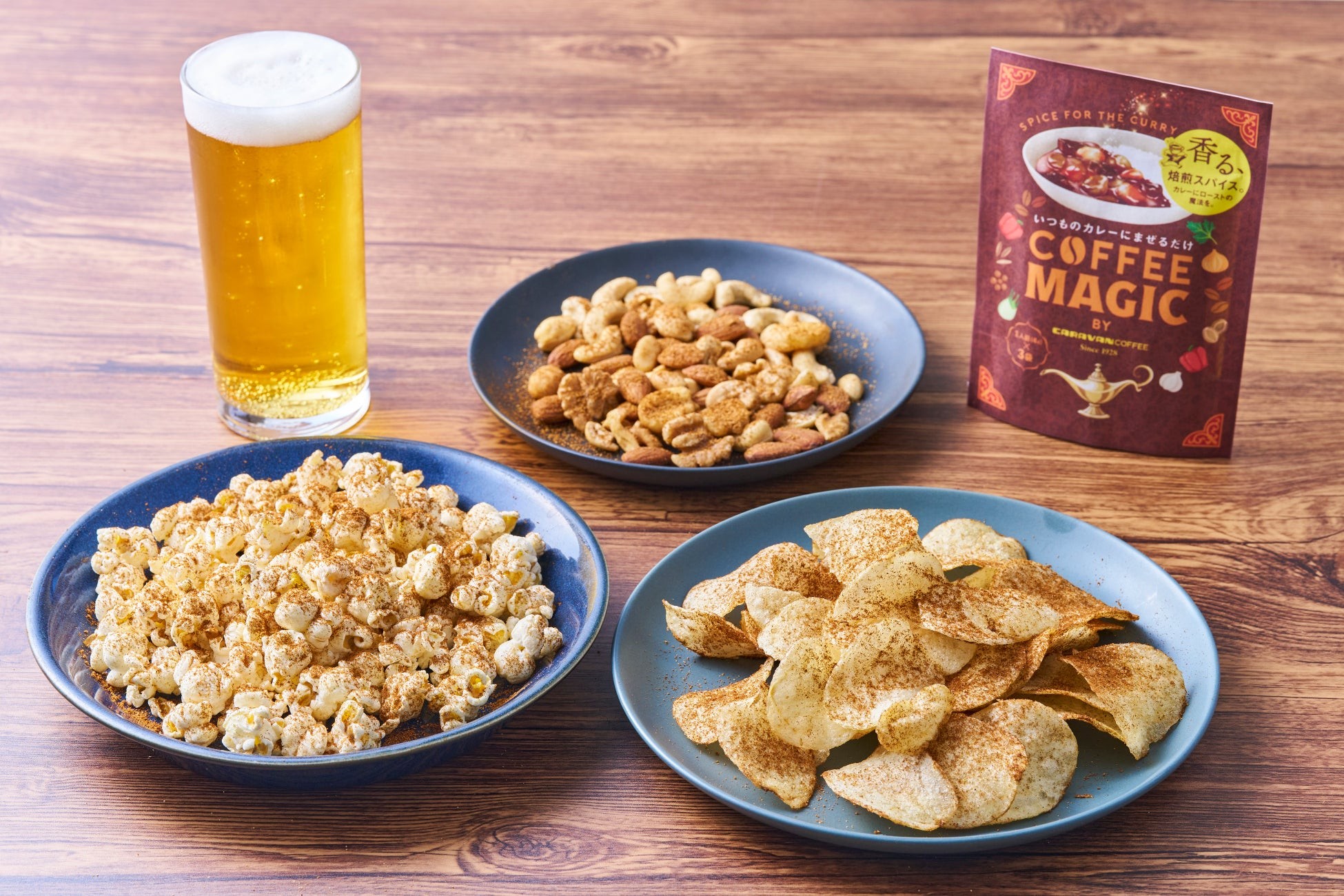 この度、キャラバンコーヒー(運営元:株式会社ユニマットライフ/本社:東京都港区/代表取締役社長 落合昭)は、9月24日(水)より、自社コーヒーと8 種類の原料をブレンドしたオリジナルスパイスミックス『COFFEE MAGIC by CARAVAN COFFEE』を発売いたします。 いつものカレーにかけてまぜるだけで、カレーの美味しさをローストの風味でさらに惹き出す仕上げ用 スパイスです。