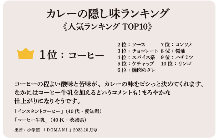 日本の家庭料理の定番であるカレーは、隠し味次第で驚くほど味が変わります。チョコレート、ソース、醤油やはちみつなど様々な食材が使われますが、「 **コーヒー」** は、隠し味ランキングで <u>1位</u> を獲得しているのです。そこでコーヒーのプロフェッショナルである私たちは「誰もが手軽に使えるコーヒーを使ったカレーを美味しくするためのスパイス」を作りたいと、スパイスのプロと共同でこの商品を開発するに至りました。コーヒーの持つ奥深い苦味と香りと8種のスパイスの絶妙なブレンドで、カレー全体のコクと風味を一層引き立てます。