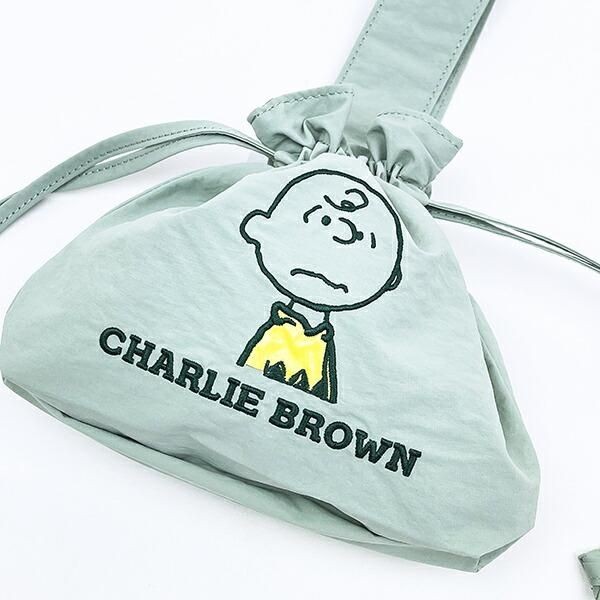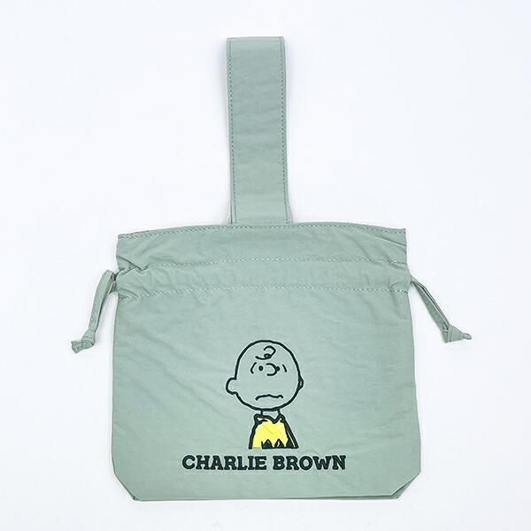 こちらはモチーフ違いで、 **チャーリーブラウン 巾着バッグ** です。落ち着いたくすみグリーンが、チャーリーブラウンの穏やかな雰囲気と相性抜群。