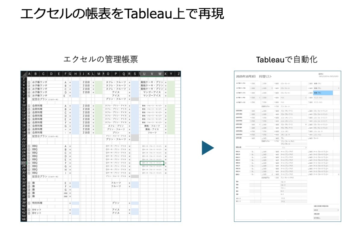 Tableauはレイアウト設定の自由度が高いため、エクセルなどで管理していた帳表のレイアウトをそのままダッシュボードに再現する、という使い方も有効ですクラウドシステムに不慣れなスタッフにも扱いやすい上に帳表にデータを自動入力することが可能で、事務作業の軽減に有効です。