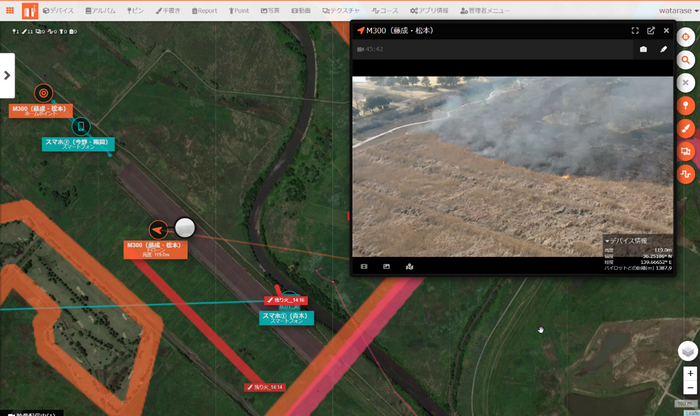 リアルタイムで位置情報と映像が確認できるシステム「Hec-Eye」を国内最大級の残火確認にドローン5台、スマートフォン2台とHec-Eyeを連携し、各機体・端末の位置情報及び映像中継を本部で確認しました。発見した残火はHec-Eye上の地図へ登録し、消防や運営関係者にリアルタイムな情報提供を行いました。対応の早期検討や現場消防隊への迅速な指示出しに繋がったことから、Hec-Eyeの有用性を確認することができました。