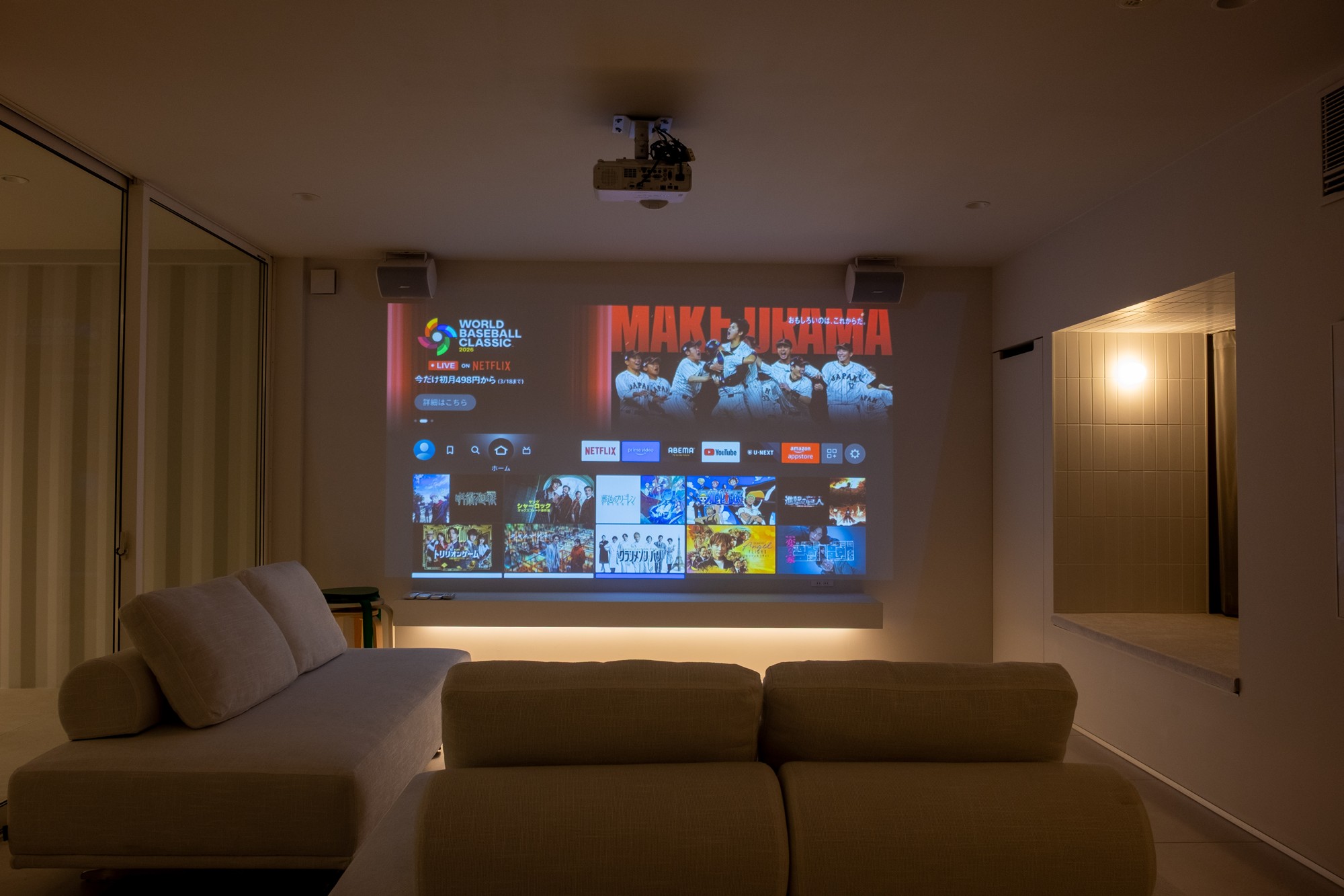 ホームシアター: BOSEスピーカーを採用し、NetflixやAmazonプライムが大画面で見放題。 雨の日や夜間でも、一歩も外に出ることなく最高のエンターテインメント体験をお楽しみいただけます。