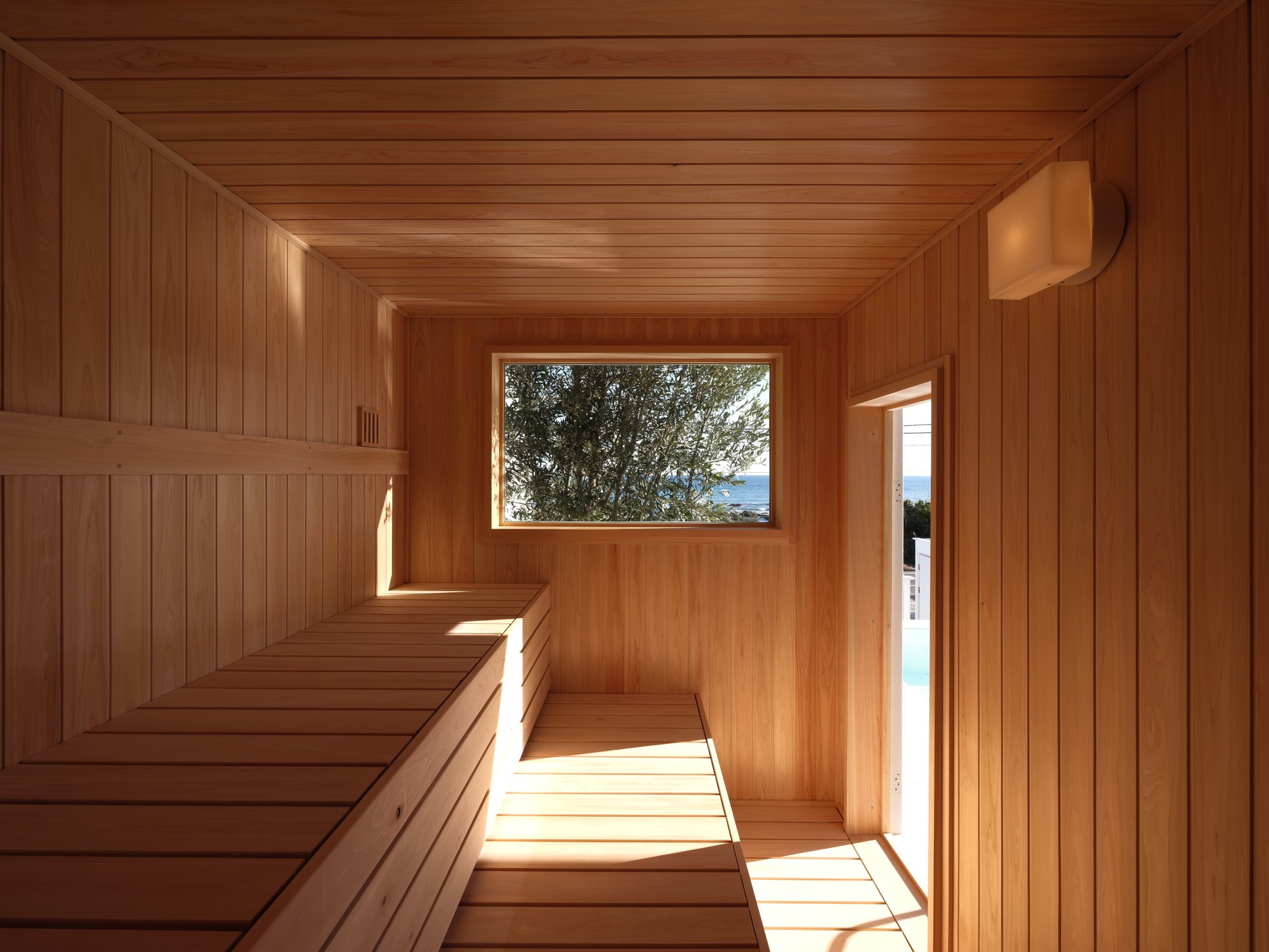 全天候型テラスには、一年中ベストコンディション(30〜34℃)で楽しめる7m温水プールと、セルフロウリュ可能な大型電気ストーブ式サウナ(8名同時利用可)を完備。 目の前に広がる太平洋を眺めながらの外気浴は、ここでしか味わえない「究極の整い」をもたらします。水着着用で24時間いつでも利用可能なため、朝日を浴びながら、あるいは満天の星空の下で、自由なスタイルでリフレッシュいただけます。