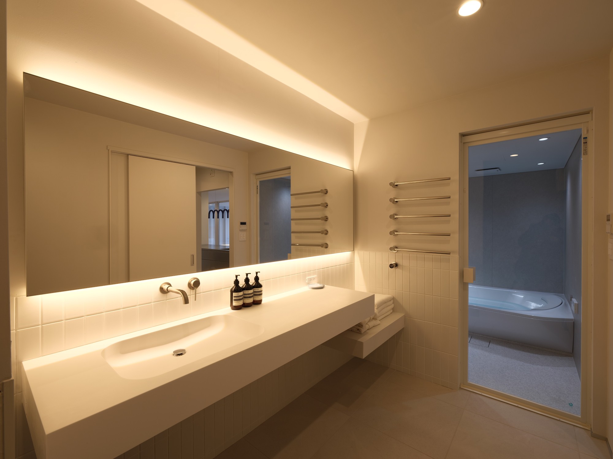 真っ白なキャンバスのような室内に、厳選された現代アートとデザイナーズ家具を配置。まるで海辺のプライベートギャラリーに滞在しているかのような高揚感を演出します。 広々としたリビングダイニングには、3口IHコンロやオーブンレンジを備えたフルスペックキッチンを完備。Refa(リファ)のドライヤーやヘアアイロン、John Masters Organicsのアメニティなど、細部にまで「上質」にこだわりました。