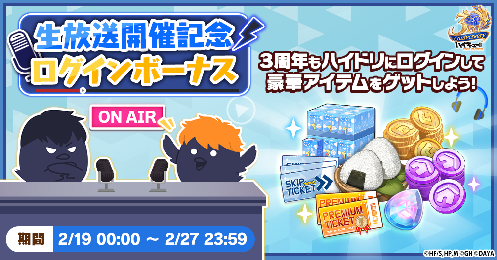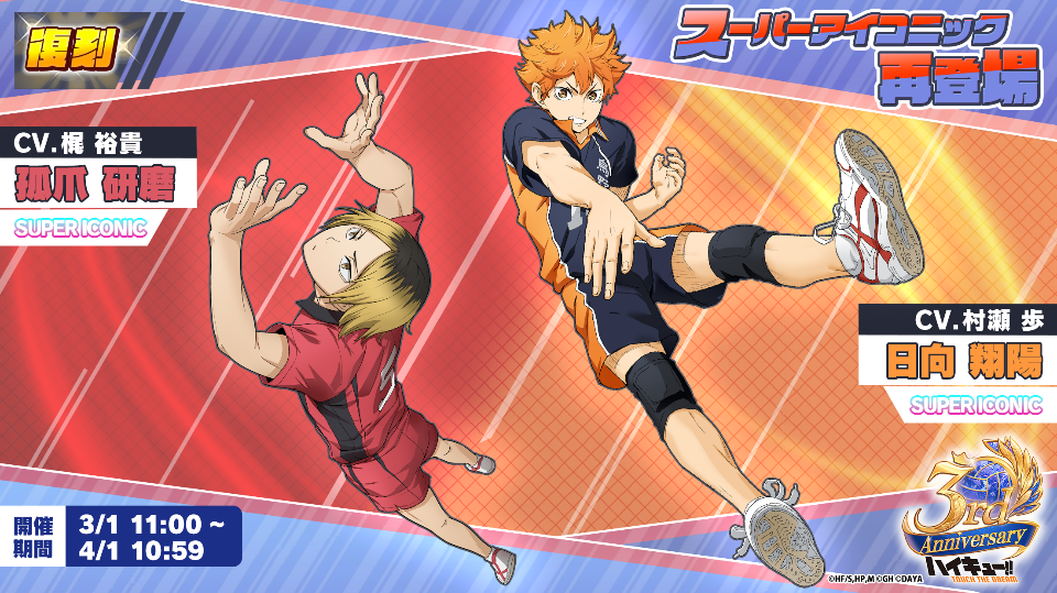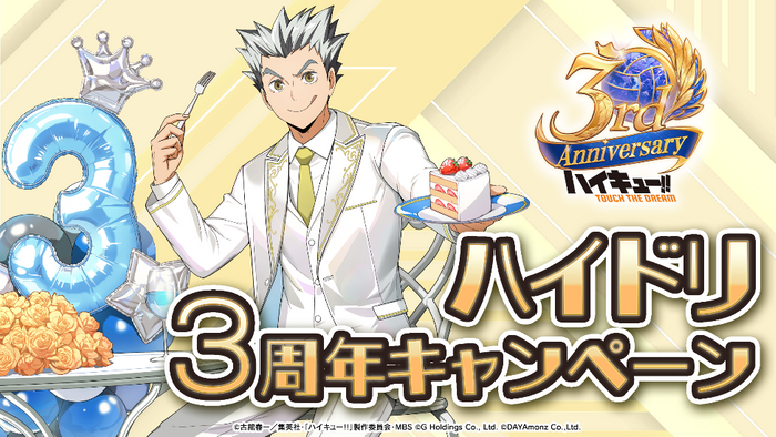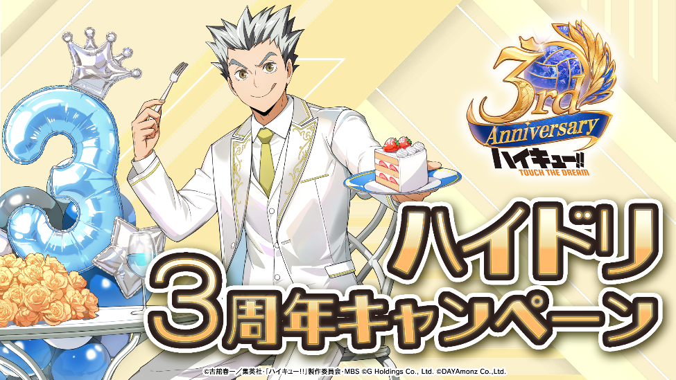 株式会社Gホールディングスは、アニメ『ハイキュー!!』のスマートフォンゲーム『ハイキュー!! TOUCH THE DREAM』略称『ハイドリ』の3周年を記念して、2026年2月24日(火)より3周年キャンペーンの開催、2026年2月25日(水)20時00分よりスペシャルなゲストをお迎えして3周年記念生放送を実施いたしますことをお知らせいたします。