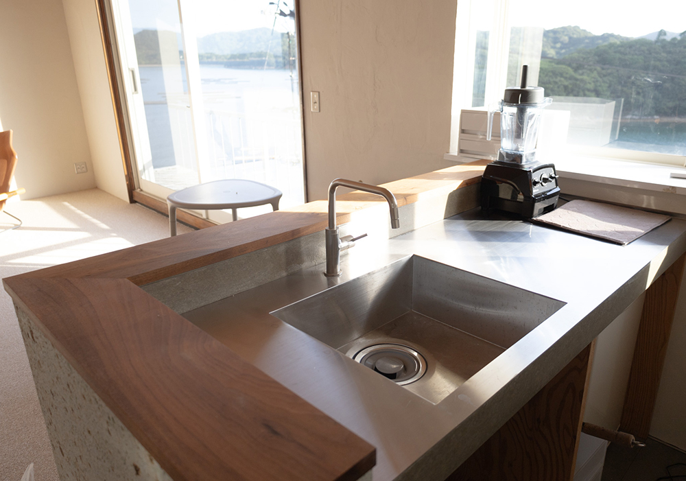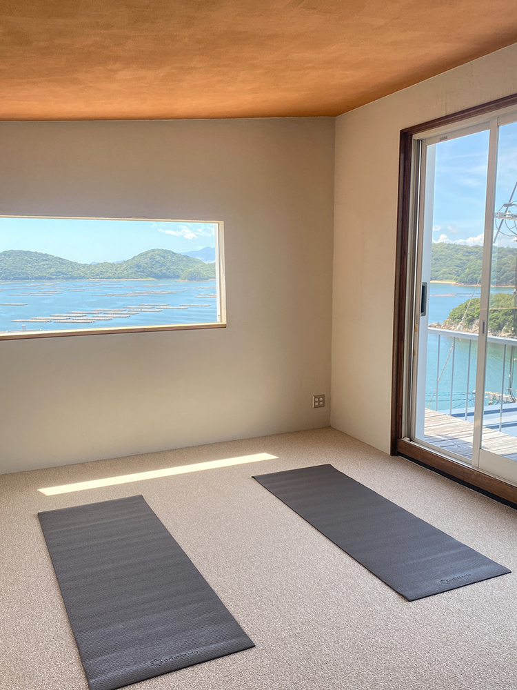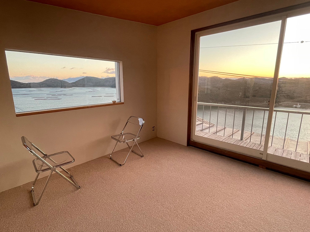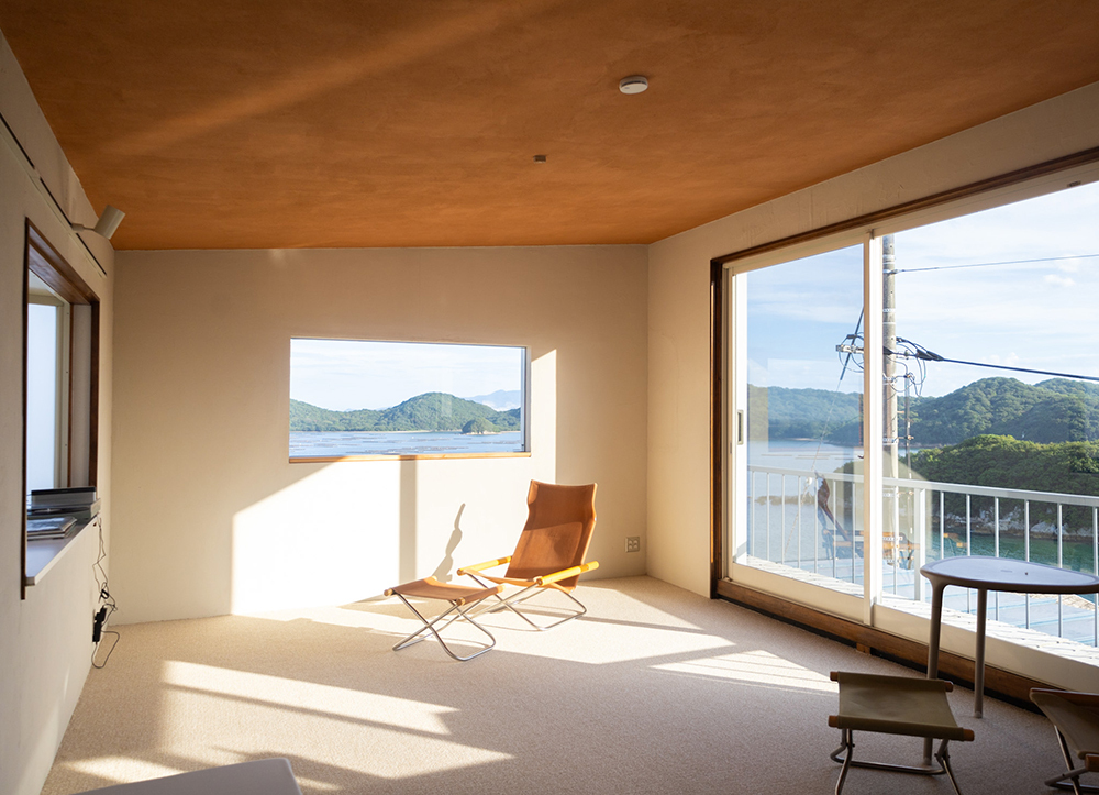 もともと同ブランドの植物染めアトリエだった建物の2階を改装したこの宿泊施設は、鴻島の岬の先端にあり、時刻によって移りゆく瀬戸内海の穏やかな景色を一望できます。