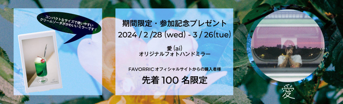 愛さんのFAVORRIC参加を記念して2月28日(水)~3月26日(火)までの期間中、公式サイトにてご購入いただいた方、先着100名様に「愛オリジナルフォトハンドミラー」をプレゼント!