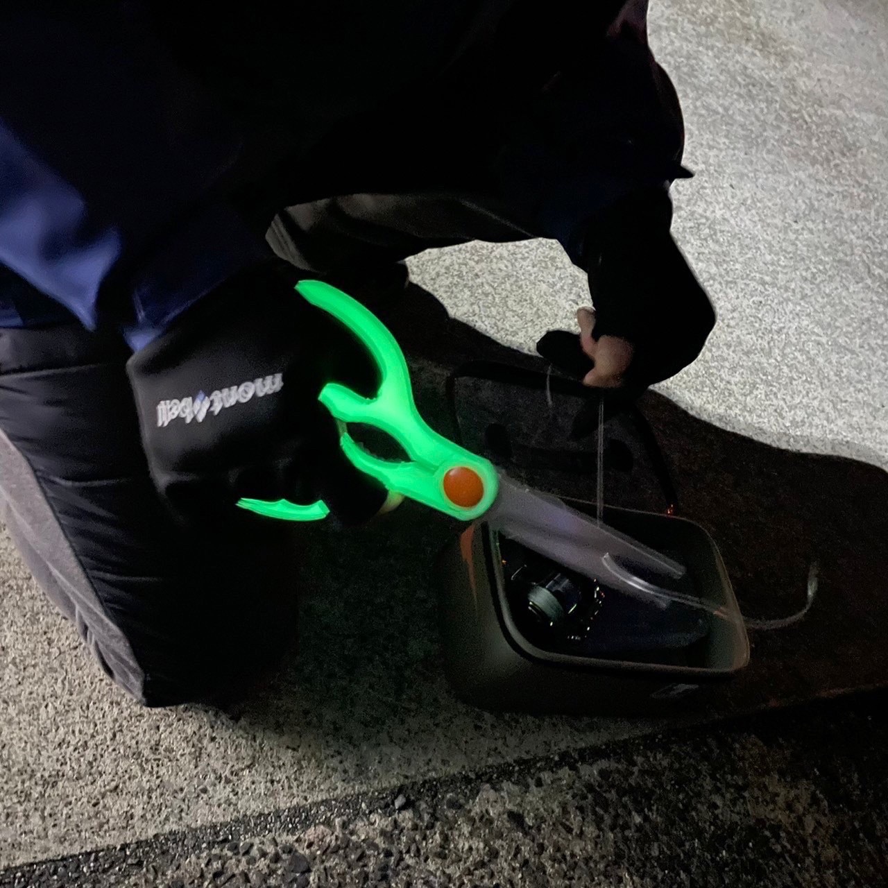 特に、(1)暗闇で光るは、これまでの救急用ハサミやアウトドア用ハサミに無い特徴であり、緊急時や夜釣り等でハサミの在処がわかるという点で重宝できます。また、(2)ダンボールオープナーは、ハサミの刃体が2つに分解できるため、片方の刃体で救援物資や薪が入ったダンボールを中身を傷つけることなく開梱できます。