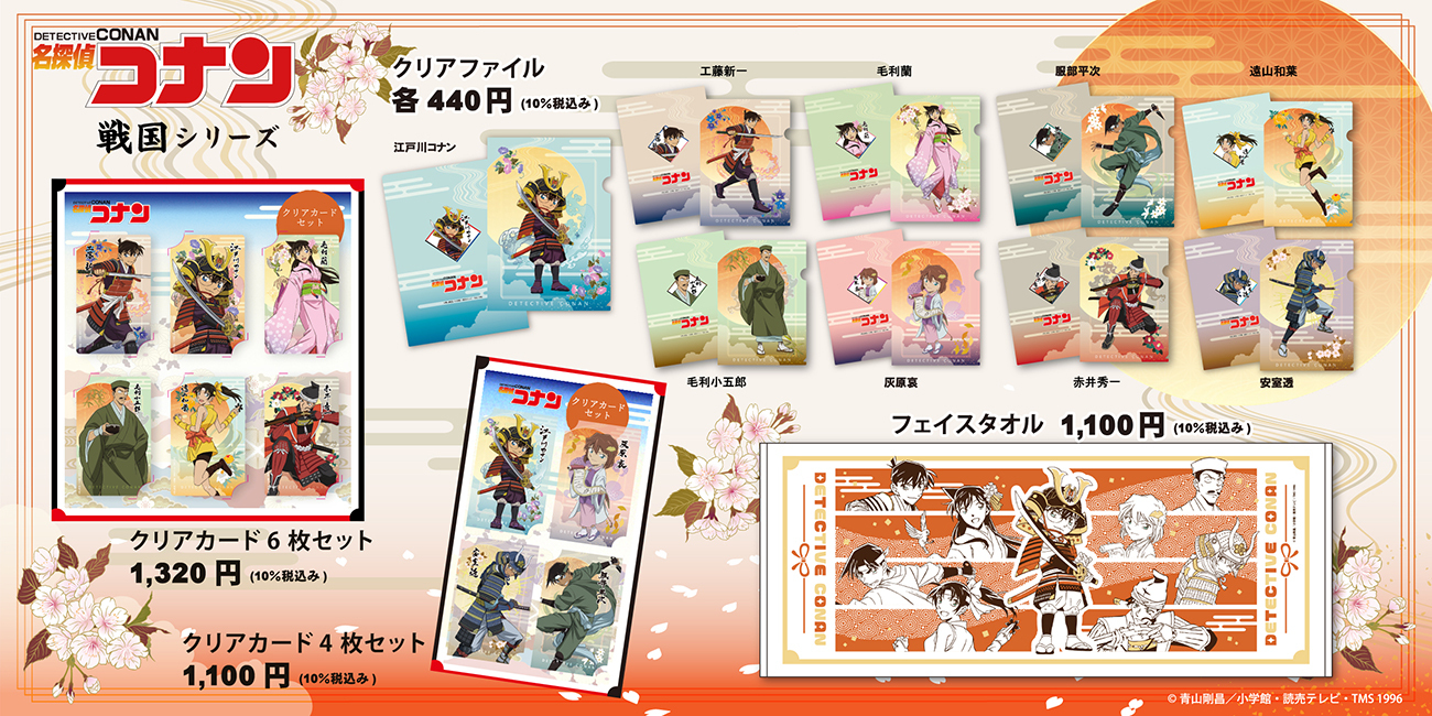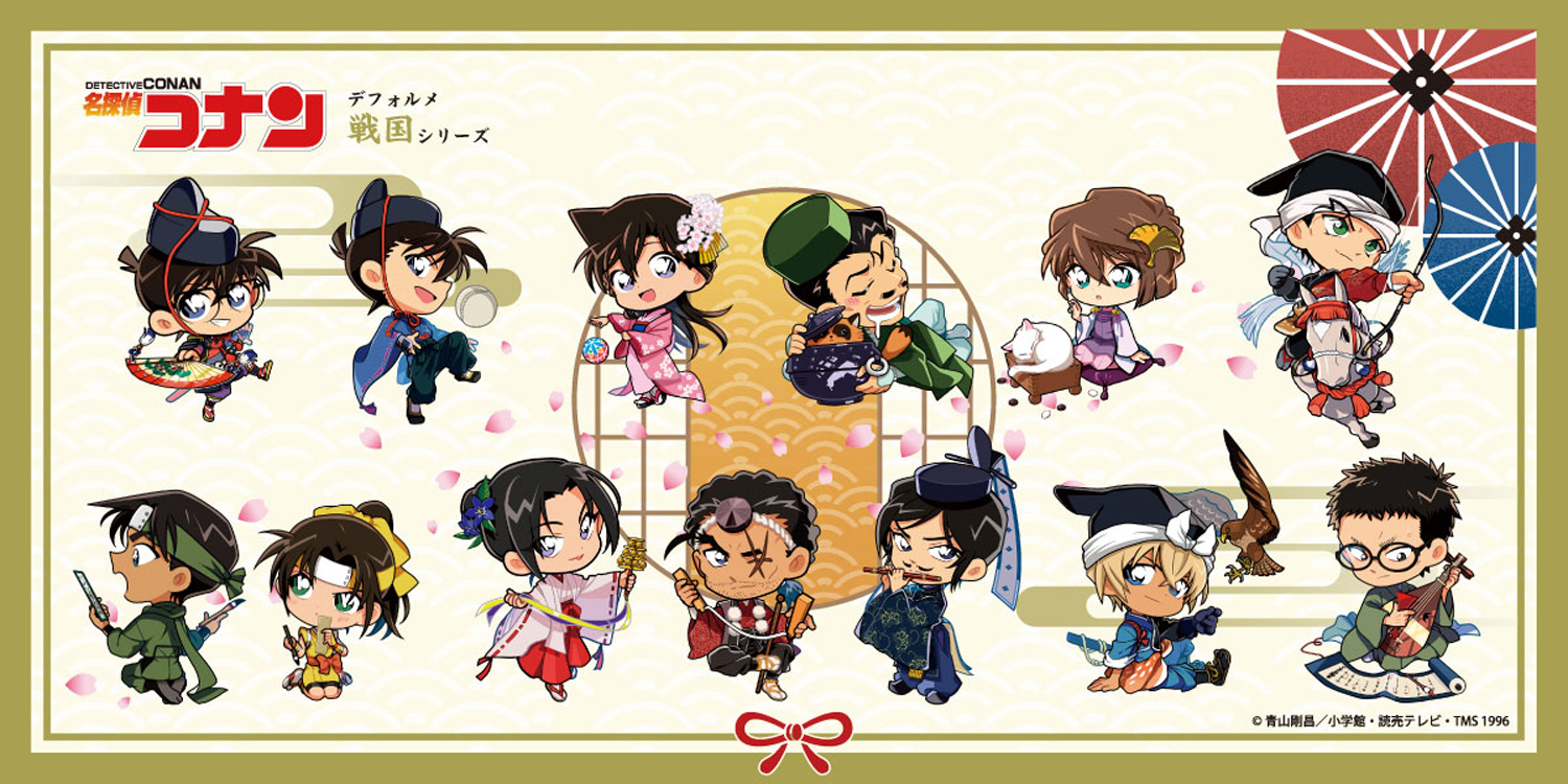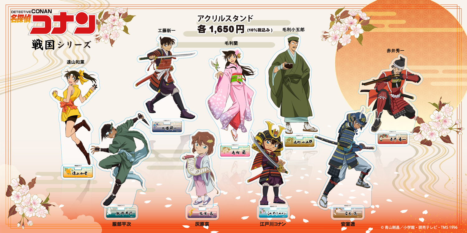 大好評の戦国時代の衣装を身にまとった描き下ろしビジュアルに、今年は「工藤 新一」「毛利 蘭」「毛利 小五郎」「遠山 和葉」「赤井 秀一」が登場。昨年の「江戸川 コナン」「灰原 哀」「服部 平次」「安室 透」と合わさりパワーアップした描きおろしビジュアル商品が発売!