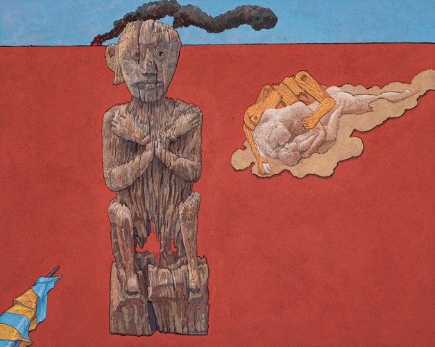 鎮魂と呪術性漂う異形の古代木像は、時と共に万物が朽ち行く無常観を暗示し、その背後には砂中に伏せる母子と、覆いかぶさる木偶が描かれている。澄んだスカイブルーの空の下、赤い地平線の彼方には黒煙が上がり、画面左下にはウクライナ国旗で包まれた機関銃が覗く。