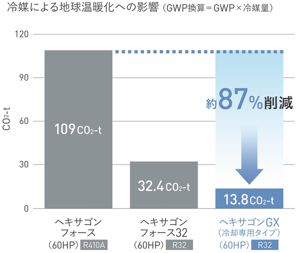 ・冷媒にR410Aを用いたモデルとの比較では、総合的な地球温暖化影響を87%削減(※5)。