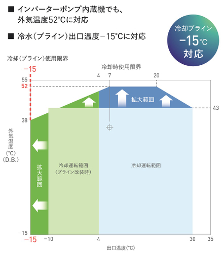 また、ブライン改装機においては従来機の-10℃よりも低い-15℃のブライン出口温度にまで対応し、より幅広いプロセス用途での冷却を実現します。