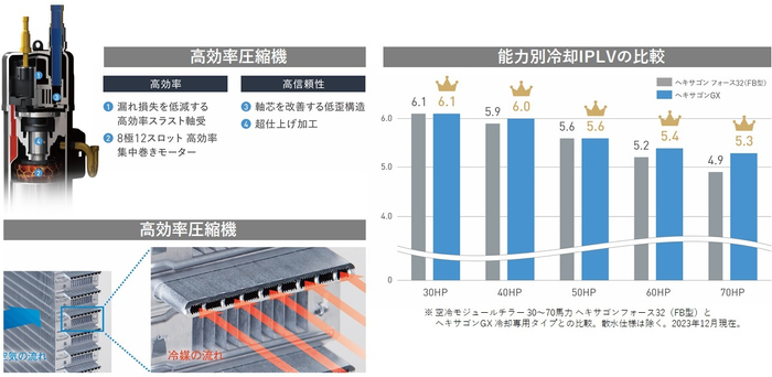 本商品は、エネルギー効率に優れた低温暖化冷媒HFC-32(以下「R32」)に適した高効率圧縮機とマイクロチャネル熱交換器を搭載し、低負荷時の運転効率を従来機と比べて最大8%向上(※2)させ、業界トップクラスの冷却IPLV(※3)を実現しました。また、冷媒充填量を従来機と比べて約57%削減(※4)し、環境負荷も大幅に低減します。