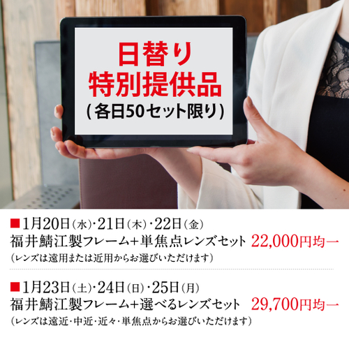 明治20年創業、今年で134年の歴史を持つ眼鏡店・株式会社金鳳堂(東京都港区、代表取締役社長:恒吉裕司)は、1月20日(水)~25日(月)・柏髙島屋 本館地下2階催会場にて「メガネフェスティバル」を開催します。福井・鯖江製のメガネフレームを中心としたレンズ付セットをお買得価格にて豊富に取り揃えます。