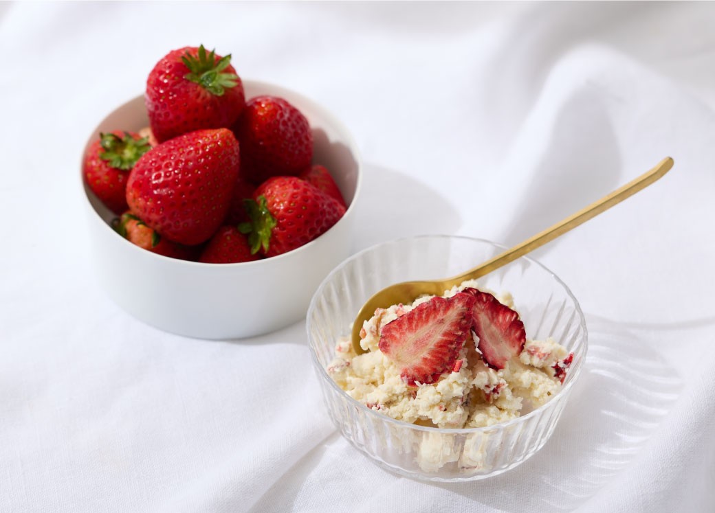 北海道産のまろやかなクリームチーズを、最高級の吟醸酒粕と芳醇なみりん粕の漬床でじっくりと熟成させ、風味豊かに仕上げたチーズの酒粕漬。そこに苺の果肉を混ぜ込むことで、酒粕の風味と苺のやさしい甘みが調和した、大人のデザートチーズに仕上げました。