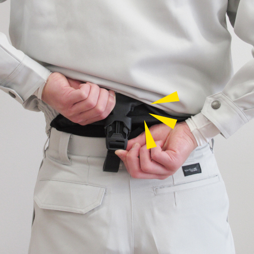 既定の作業着や制服等の関係で従来のアシストスーツの着用ができないという声を踏まえ、作業着の中へ着用できるように設計しました。サイズ調整やアシストのON/OFFの切り替えは、背中~腰部分にある調整ベルトとアタッチメントのみで完了するため、アシストスーツの上に作業着や制服を着たままで過ごせます。また、作業着の中への着用が可能になったことで、ハーネス等の装備とも併用できます。