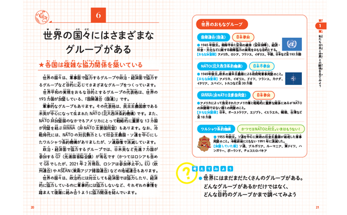 ●P20-21「世界の国々にはさまざまなグループがある」では,NATO(北大西洋条約機構)や国際連合(国連)についても解説。