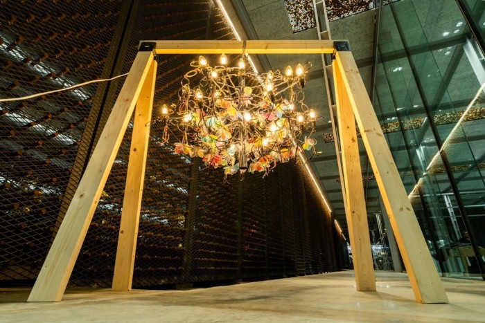 近畿大学経営学部の金泰旭ゼミは、メガネの田中との産学連携プロジェクトとして「日本で一番楽しく選べる、選んでもらえるメガネ専門店」であることを広く発信するため、廃棄メガネを使用したアート作品としてシャンデリアを制作しました。