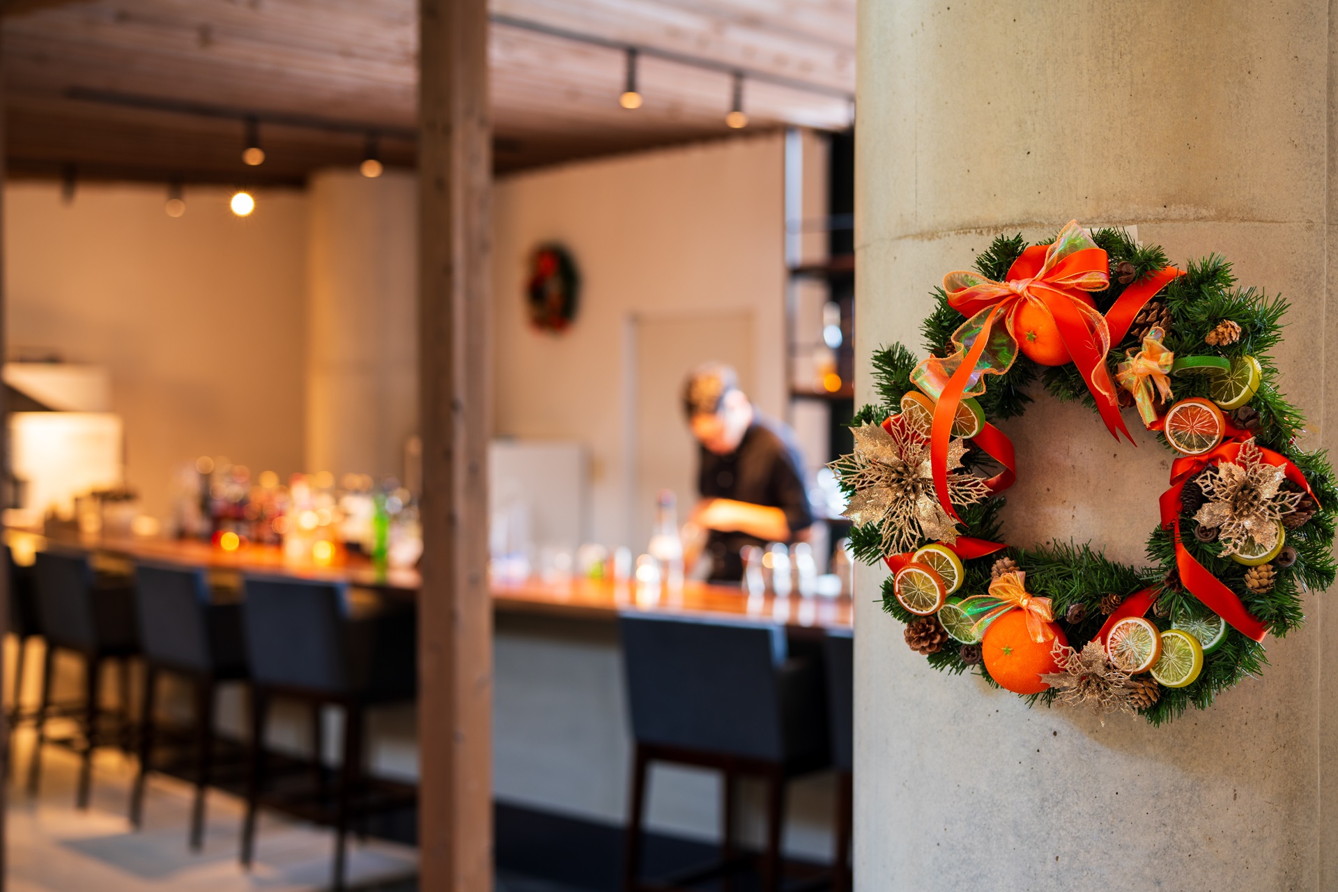 ・みかんやオレンジをモチーフにしたリースやツリーの館内装飾。
