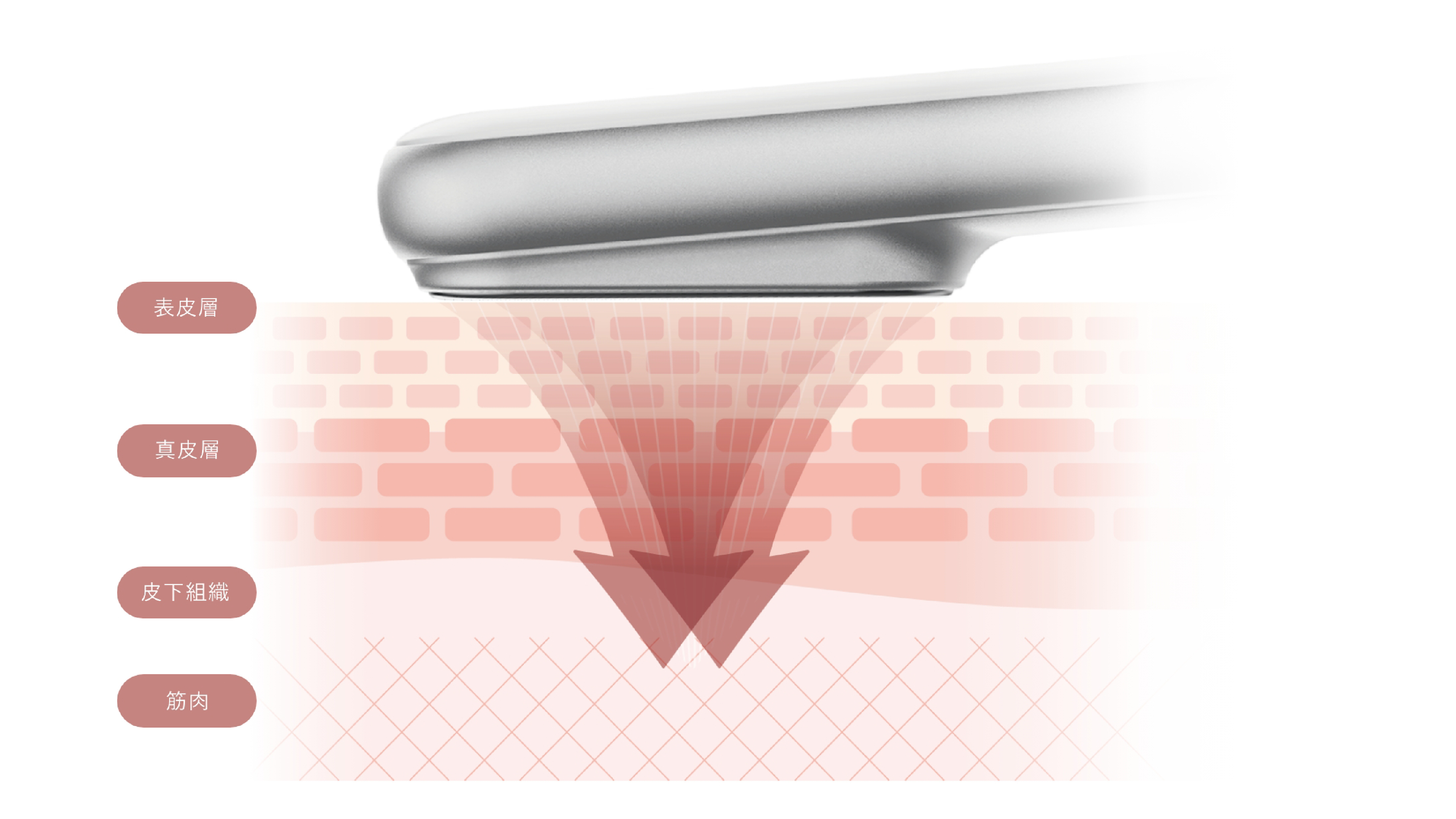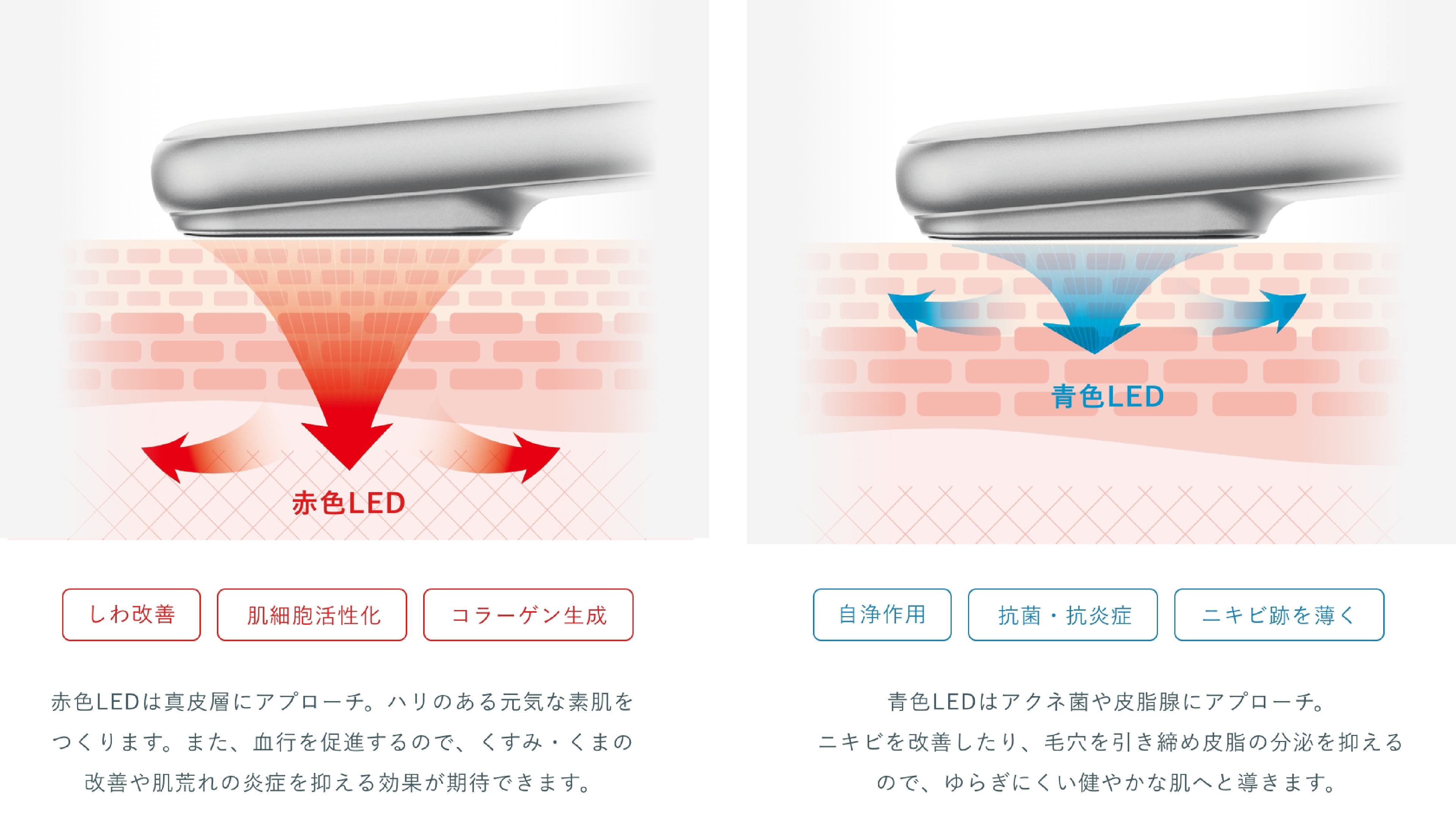 美容クリニックでも使用されている安全性の高い光美容テクノロジーであるLEDを搭載。光の色(波長)によって到達する深さが変わり、肌の真皮層にまでアプローチすることが可能です。