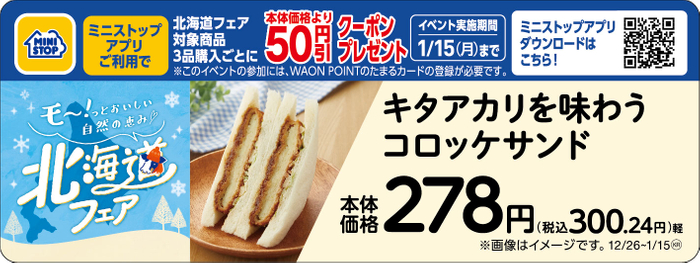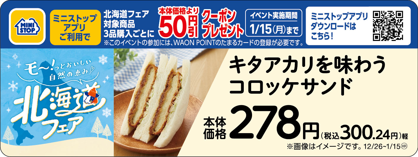 ミニストップは、モ~!っとおいしい自然の恵みを感じて頂きたく、2023年12月26日(火)~2024年1月15日(月)の期間「北海道フェア」を開催いたします。北海道産豚肉(ブランド名:夢の大地)を使用した「炭火焼き豚丼(北海道産豚使用)」(税込:645.84円)※1、北海道産枝豆、秋鮭を使用したおにぎり「枝豆と秋鮭のごはん」(税込:140.40円)※1、キタアカリを使用したコロッケと濃厚ソースが特長の「キタアカリを味わうコロッケサンド」(税込:300.24円)※1を2023年12月26日(火)より、もちもちとした生地にミルククリームを合わせた和洋折衷スイーツ、「もちまる焼き 北海道ミルク」(税込:170.64円)※1、なめらかな食感で濃厚ながらもすっきりとした味わいのミルクプリン「北海道ミルクプリン」(税込:267.84円)※1、ケーキ生地とさっくり食感のクッキー生地を組み合わせた「北海道ミルク クッキーケーキ」(税込:149.04円)※1を、2024年1月4日(木)より、国内のミニストップ店舗にて発売します。また、ミニストップアプリで、北海道フェア対象商品を3品購入ごとに、「こだわりミルクホットカフェラテ」「こだわりミルクアイスカフェラテ」、が本体価格よリ50円引になるアプリクーポンプレゼント企画を、2023年12月26日(火)~2024年1月15日(月) の期間実施いたします。(本企画に参加いただくには、ミニストップアプリに会員登録し、WAON POINTのたまるカードの登録後、ミニストップアプリ会員バーコードを提示・スキャンしての購入が必要となります。カフェラテは、一部店舗では価格・仕様が異なります。一部店舗ではご利用できません。)北海道の原料・食材を使用した、ファストフードの人気商品、「ソフトクリームバニラ(コーン・カップ)」、「北海道チーズインナゲット」 、「こだわりミルクのホットカフェラテ/アイスカフェラテ」も、北海道フェア対象商品となります。