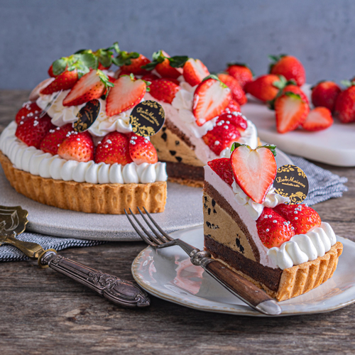 【商品詳細】しっとりとしたブラウニータルトにほろ苦いココアビスケット入りのミルクティークリームといちごのクリームを重ね、大粒の甘酸っぱいあまおうの飾りました。