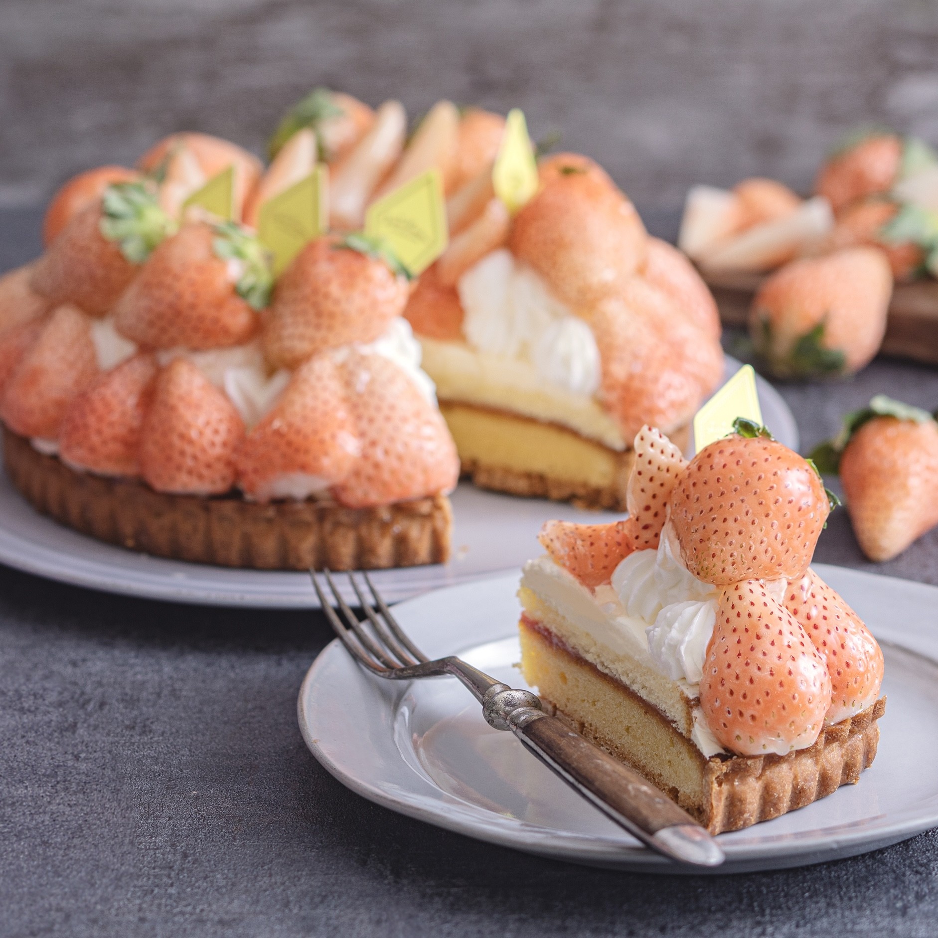 【商品詳細】桃のような香りの白いちご「雪うさぎ」を贅沢に使った季節限定プレミアムタルト。ケークタルトにディプロマットクリームといちごジャムを重ねました。ほんのりさくら色に色づいた可愛らしいちごのタルトです。