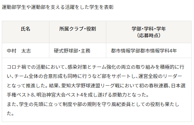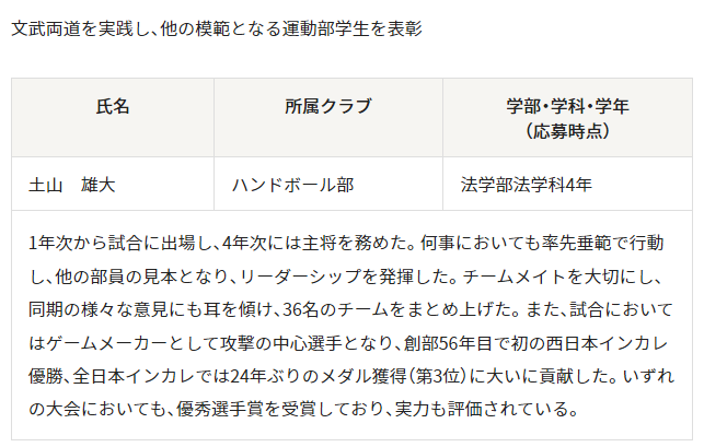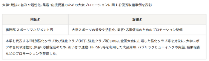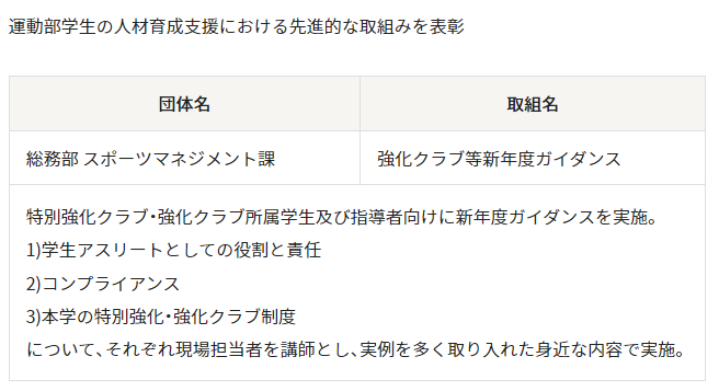 【名城大学】『UNIVAS AWARDS 2022-23』の優秀賞と入賞を獲得 学校法人 名城大学 2023-02-16 07:30 一般社団法人大学スポーツ協会「UNIVAS(ユニバス)」が主催する『UNIVAS AWARDS 2022-23』において、3年連続、本学及び本学学生が〈優秀賞〉〈入賞〉を受賞しました。 UNIVAS AWARDSは競技成績だけではなく、学業充実や安全安心、大学スポーツの盛り上げなどに著しい成果をあげ、同協会の理念の体現に貢献をした学生アスリートやスポーツに関わる学生、団体を表彰します。 〈優秀賞〉マイナビ賞「人材育成支援に関する優秀取組賞」 〈入賞〉マン・オブ・ザ・イヤー 〈入賞〉サポーティングスタッフ・オブ・ザ・イヤー 〈入賞〉KDDI賞「大会・プロモーションに関する優秀取組賞」 【ハンドボール部】全日本インカレで24年ぶり全国3位!! ハンドボール部が11月3日から豊田市など... https://www.meijo-u.ac.jp/news/detail_28050.html 【硬式野球部】明治神宮野球大会 43年ぶりのベスト4で終える 1979年以来43年ぶりの決勝進出はなら... https://www.meijo-u.ac.jp/news/detail_28098.html ジャンル: スポーツ タグ: UNIVASAWARDS 大学スポーツ 文武両道 人材育成 運動部 ハンドボール 硬式野球 名城大 画像一覧 一括ダウンロード