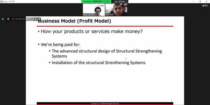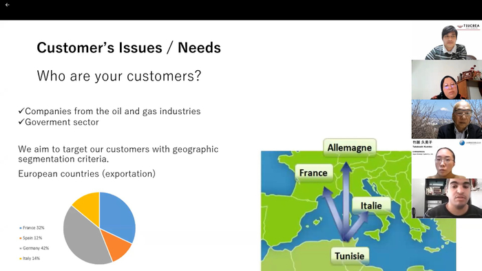 プログラム最終日<Day5>は、参加者が登壇しピッチを行う「Demo Day」を開催。本番のピッチ同様、Tunis El Manar Universityの教員と、ツクリエ、テイーエスアイ株式会社、日本戦略投資株式会社の役員メンバーがオーディエンスとして参加し、ピッチ後に質疑応答や意見、感想の共有をしました。最後に、参加者の感想やTunis El Manar Universityの教員から一言をいただきました。