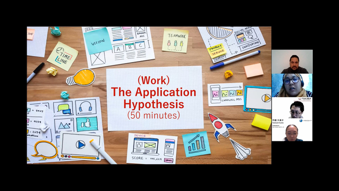 〈Day2〉は、用途仮説と仮説検証のレクチャーを中心としたワークショップを実施。理論、基礎的な考え方、具体例のレクチャーに加え、ワークを通じて参加者の理解を深めました。レクチャーの後、グループに分かれてコミュニケーションを図り、意見を交換。最後に講師がDay2の総括を行いました。