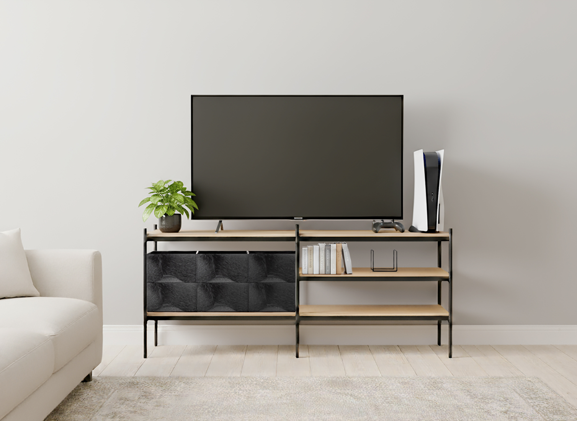 壁際に設置してもケーブル類が通せるので、テレビ台や作業台としてもおすすめ。