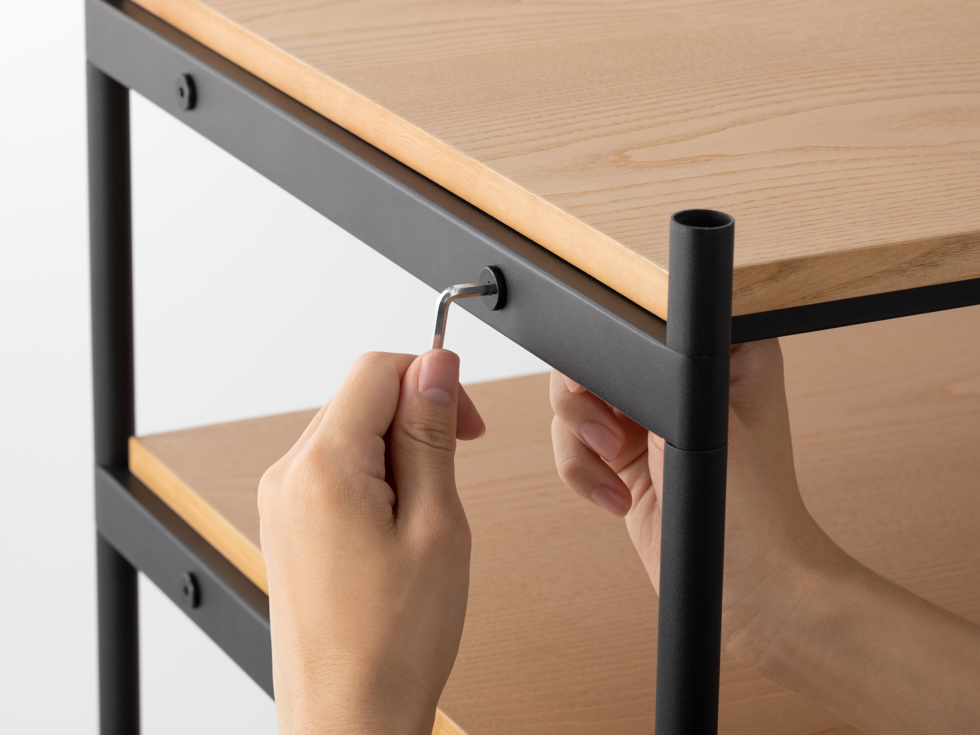 付属の六角レンチだけで組み立て可能。支柱は上から締め込むだけ。棚板は外側と内側からボルトで固定します。