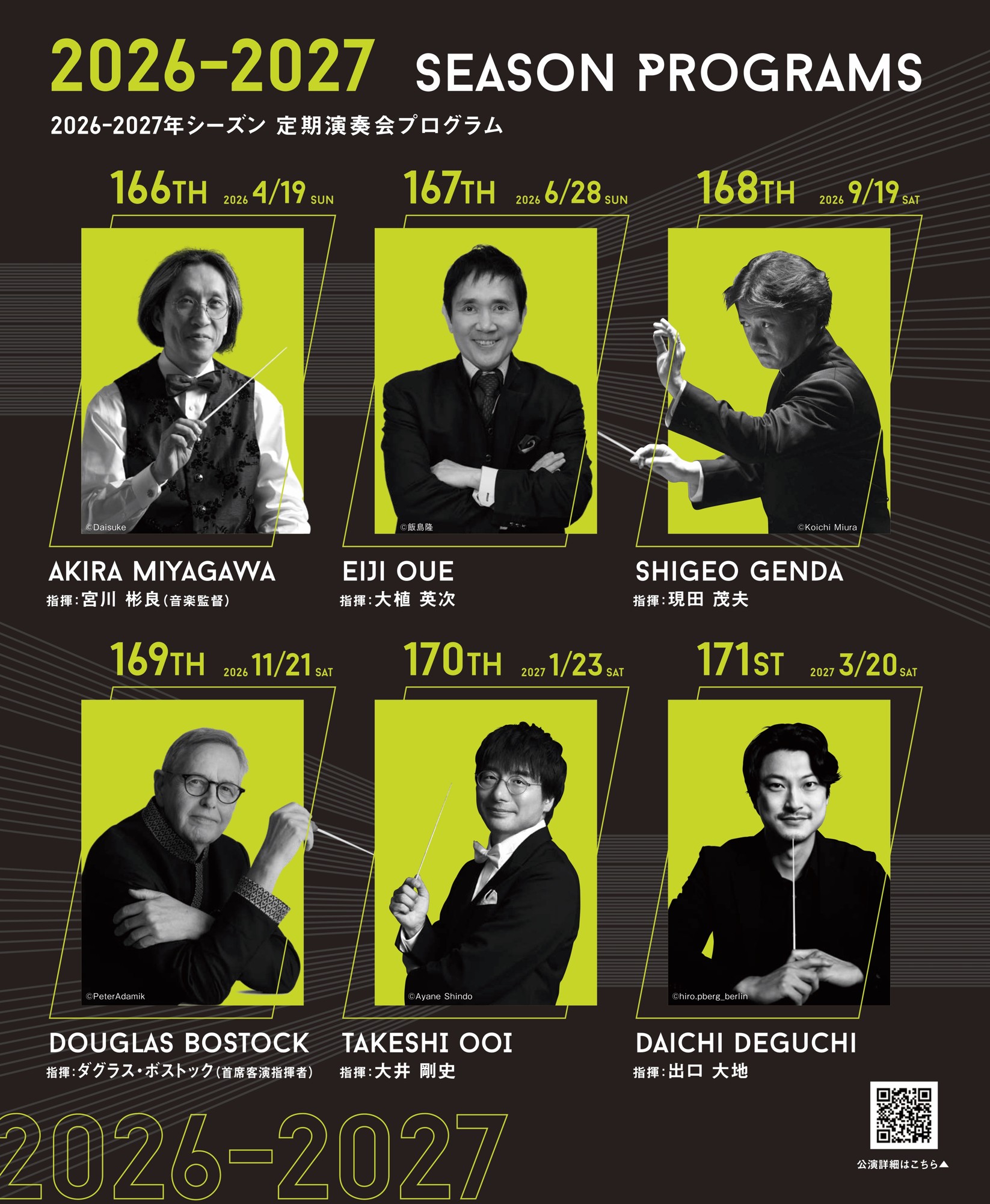まず登場するのは音楽監督・宮川彬良。没後20年となる父・宮川泰の音楽の数々を、こだわりのステージングでお届けします。続いて、共演の度に想像を超える化学反応を起こしてきた大植英次とは、ワーグナー「ニーベルングの指環」をメインに神話の世界を、絶大な信頼関係で難曲を名演に昇華させてきた現田茂夫とは、”今だからこそ紹介したいアツいオリジナル作品”6曲を、それぞれ熱演します。首席客演指揮者として2年目を迎えるダグラス・ボストックとは、イギリスの気品を漂わせる名作曲家ゴードン・ジェイコブを特集し、続けて吹奏楽を知り尽くす大井剛史を迎え、彼が大ファンを公言する大阪の星・酒井格を特集します。この演奏会のために交響曲が書き下ろされ、世界初演となります。シーズンの最後には昨年度のMARCH!MARCH!MARCH!での共演が好評を博した出口大地が登場。彼の名を押し上げたハチャトゥリアン国際コンクールになぞらえて、名曲「アルメニアン・ダンス」をメインに、アルメニアゆかりの音楽をお送りします。