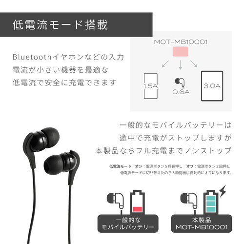 ・Bluetoothイヤホンなどの入力電流が小さい機器の場合にも、最適な低電流で安全に充電できる機能を搭載しています。