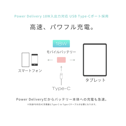 ・PDに対応しているUSB Type-Cポートと、USB Type-Aポートを搭載しており、最大18W(9V×2A)の急速充電が可能。対応機種なら50分で80%の充電が出来るので、短時間しか充電が出来ない時や急なお出掛け時にも役立ちます。