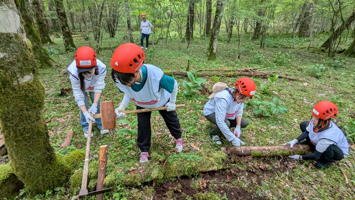 参加者は、歩道に適した長さ・太さの木材を選び運搬をし、設置場所ではハンマーを打ち込む作業をし、1本1本を丁寧に固定していきました。作業中は声がけやサポートなど、自然とチームワークが生まれ、部署や役職を越えた一体感が現れました。