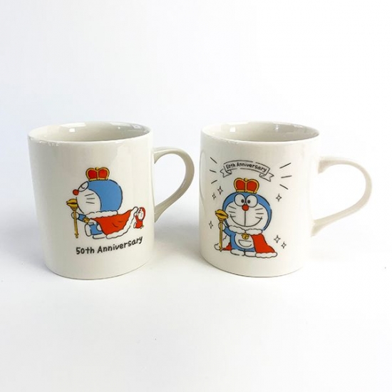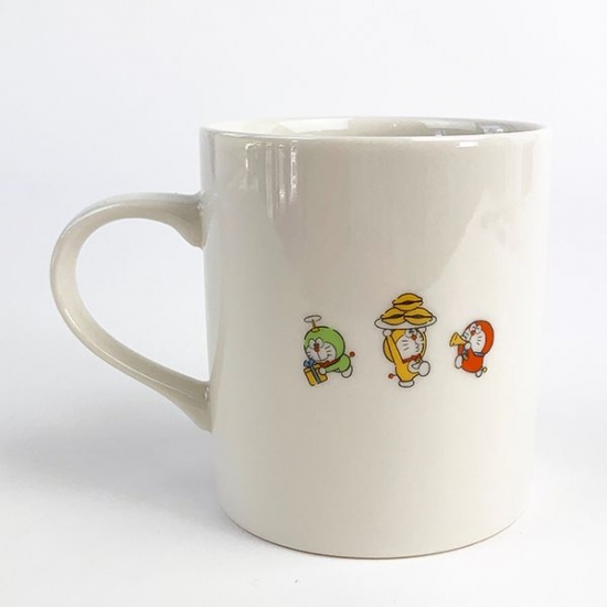 こちらは、横向きデザインのマグカップ。小さなドラえもんが付き添っています。アニバーサリーロゴも入っていて、プレゼントにも最適ですよ。