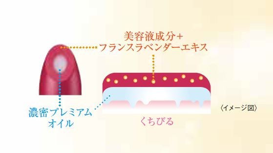 濃密プレミアムオイル配合で、唇のシワやしぼみをカバーし、ツヤ感を与えてくれる質感です。