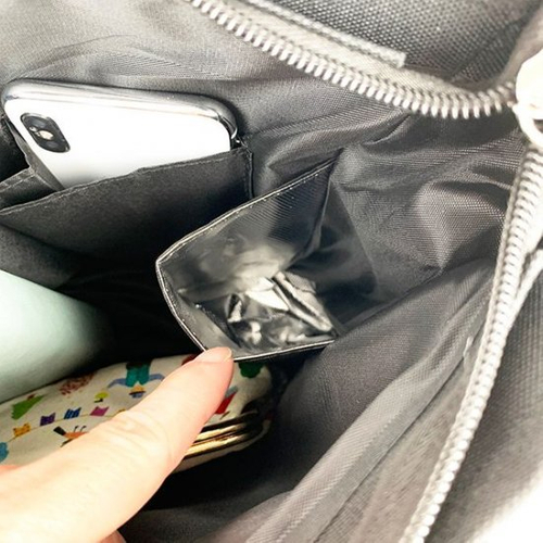 最大のポイントはコチラ!内側にアルミ蒸着のポケットがあるので、ここにペットボトルが収納できるんです。市販のペットボトルだけでなく、ご自身のマイボトルなども入れらますよ♪