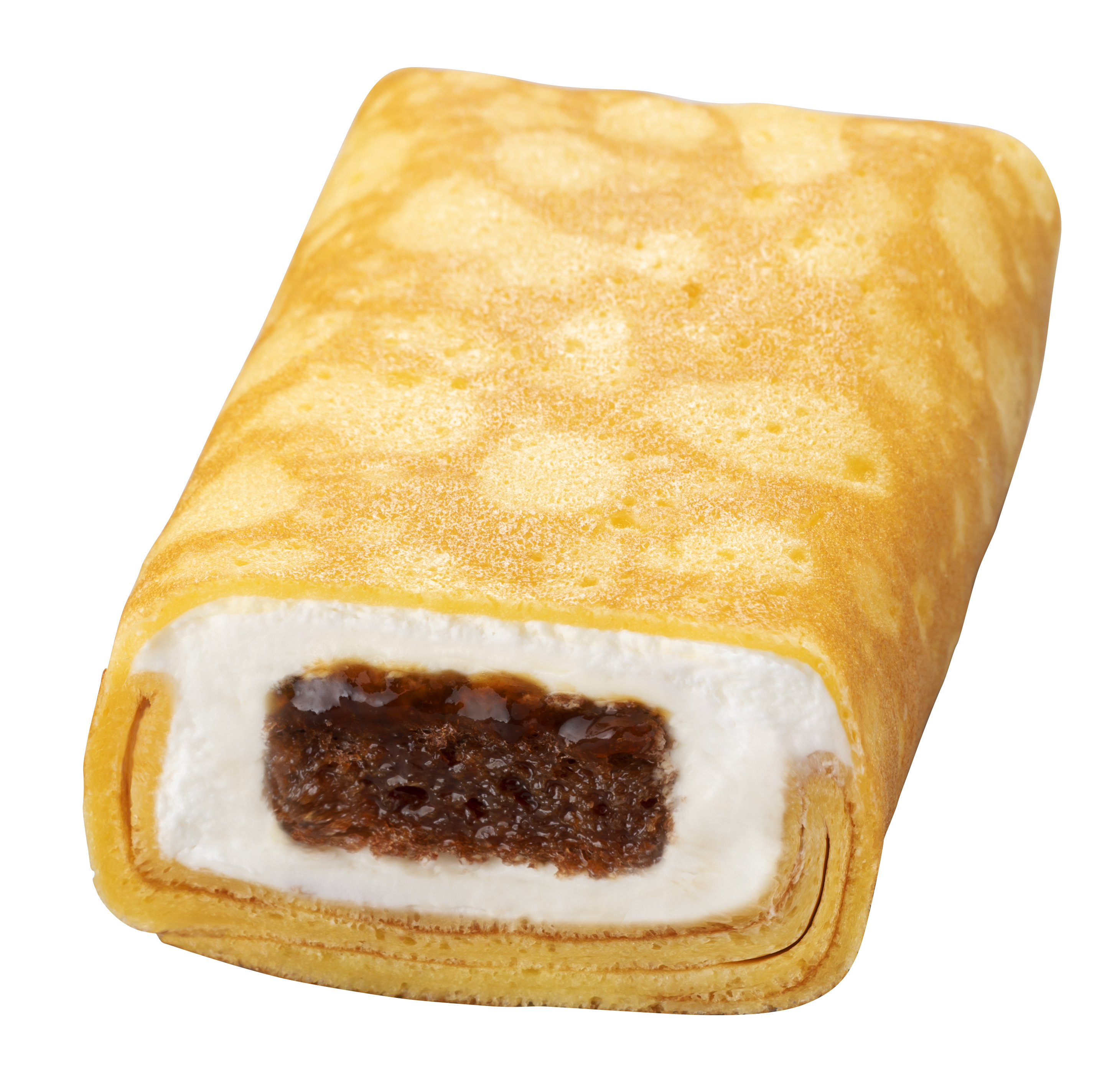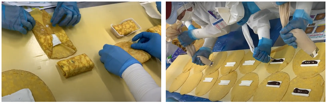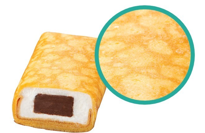 従来品は、素材をふんわりと包み込んだ正方形の形状だったのに対し、本商品はやさしい包み込み方はそのままに、より食べやすさを追求し、スティック状にしました。スティック状のクレープが入った容器についても折れ曲がる仕様となっており、より食べやすさを追求しております。