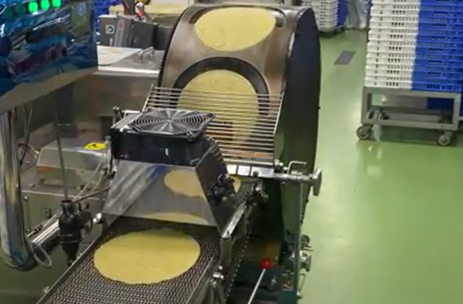 クレープの生地といえば、適度な焼き色が付いたキリン柄が特徴です。「ファミマ・ザ・クレープ」では、そのキリン柄の美しさにもこだわり、オリジナルのクレープ粉の配分や、生地を焼く際の温度の微調整を重ねました。水車式の機械を使用して焼き上げます。