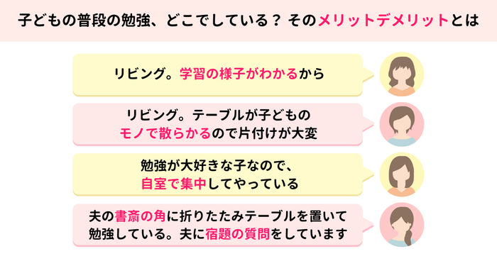 リビングを選択した方からは、「目が届く」「進捗が分かる」など、親が見守られる安心感を挙げる声が多く見られました。